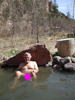 In the last Newsletter we did an editorial on various 19th century Malvern doctors and we invited Friends to suggest further names where the above headings might apply. Several suggestions (a couple unprintable) resulted, including one of a doctor (D.Phil) who was recently spotted cavorting naked in an open air hot spring in the United States. Our under cover reporter fortuitously secured a photograph which we reproduce here. Only the cavorter's name goes unpublished. The location of this indulgence was the Gila Hot Springs that are located near Silver City in New Mexico. Here there are several pools which vary in temperature slightly but all within the 110 – 105 degree F range. The site is organised to facilitate bathing and nearby camping but to the casual observer would appear to be natural. A low level of supervision also applies but visitors are left largely to their own devices. Such sites are particularly popular in the US and rather like Malvern Springs and Wells, guide books exist to the many natural hot spring sources that can be visited. Perhaps we should initiate something along these lines for the Malvern Hills? There are two problems - firstly no hot source water - and secondly the sight of Dr B cavorting may elicit a response that is less than favourable!