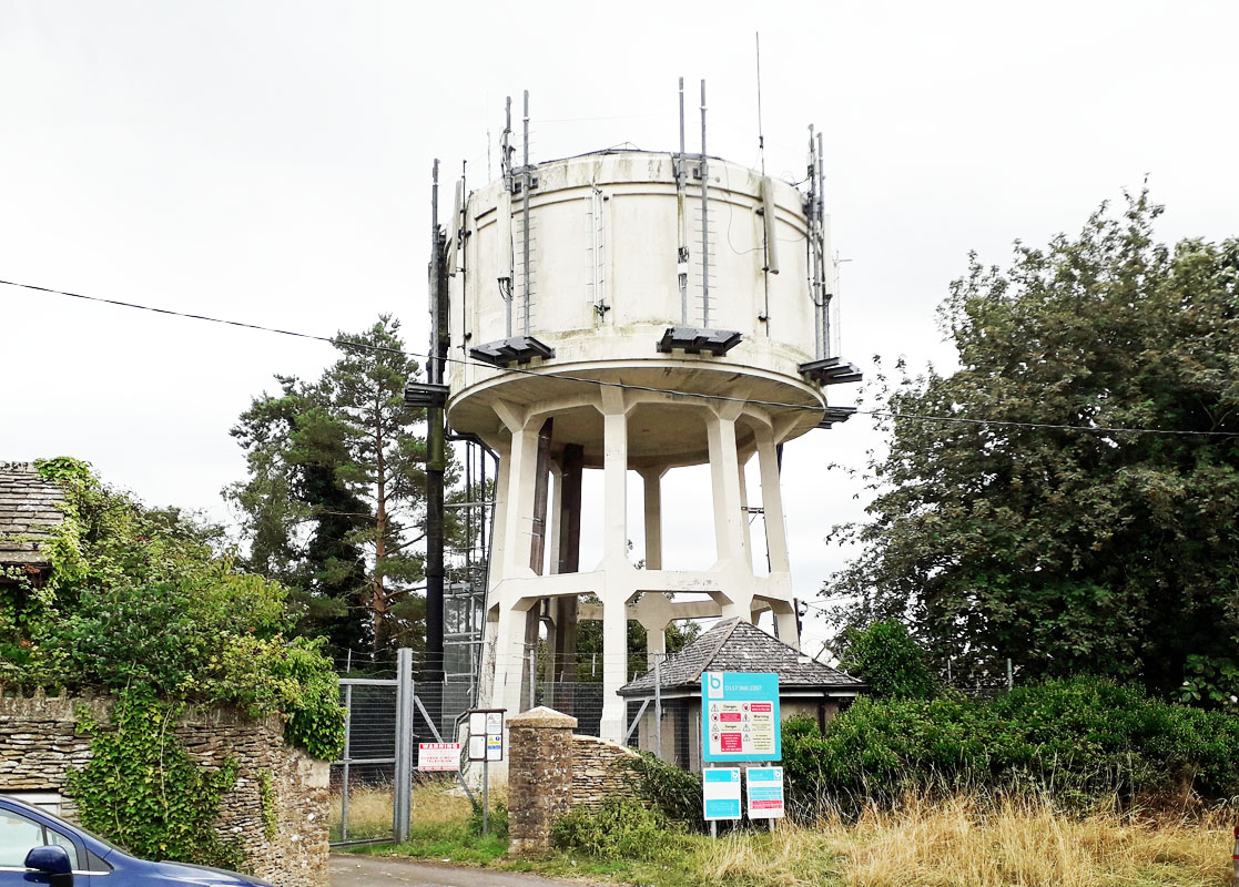 FAIRFORD WATER TOWERS, (14GL12/13) There are two water towers in the vicinity of Fairford, south of Quenington, Glos. To view the first, which lies isolated in a field, take the A417 from Cirencester to Lechlade, which passes through Fairford. As you approach Fairford turn left at Milton End to Quenington. After about a quarter of a mile take the minor road to the right and the tower can be seen in the field to your left. Grid Ref. 147013. Click left for a picture.