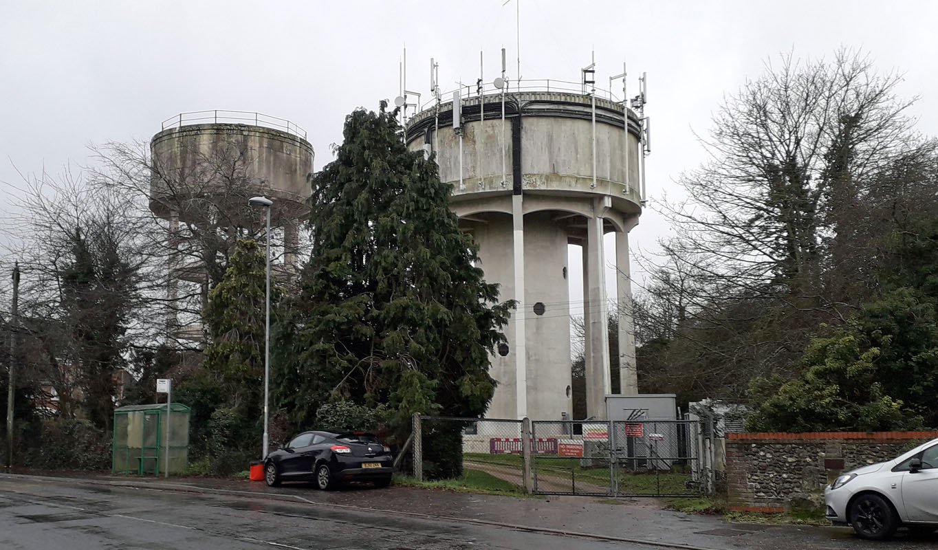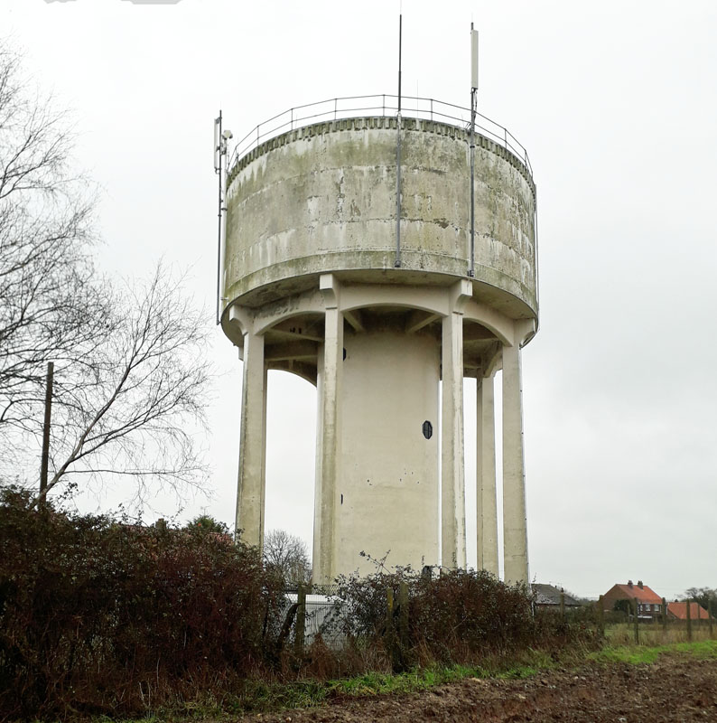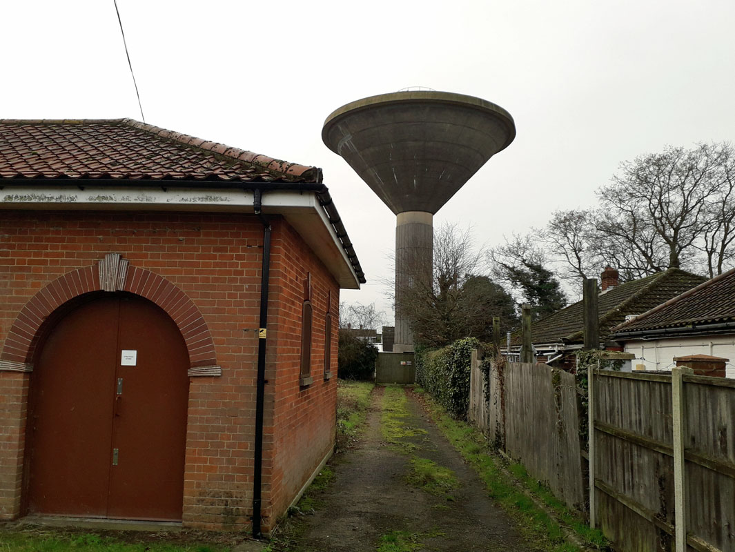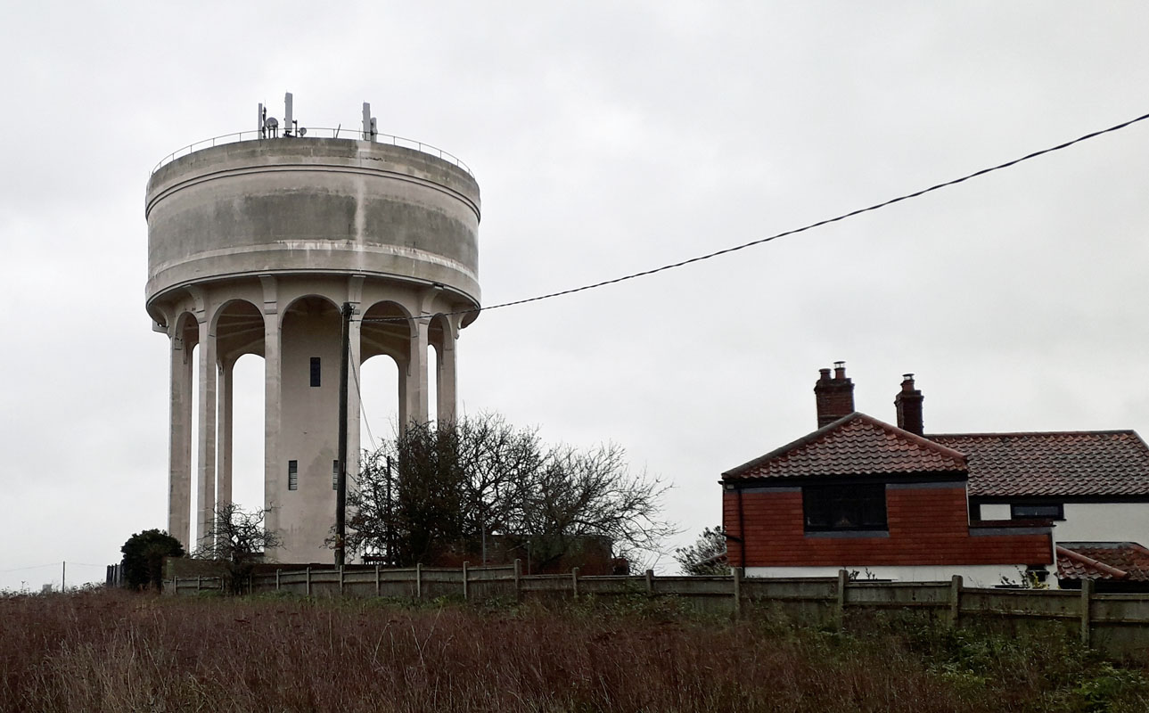 HORSTEAD WATER TOWERS (13NF39) This unusual water tower was built in the 1960s or 1970s. It is located at Horstead Lodge on the B 1150 road just south of Horstead village and Coltishall. Grid Ref 263187. Click right to view it. A second tower exists near Horsted. This lies to the north-west of the village at Horstead Hall. The red brick stable block and water tower are the only visible remains. Click left to view. Built in 1835 on the site of an Elizabethan house, the Hall was demolished in the mid 20th century. During WW2 it was a cipher clerk training school. The house was the home of the Harbord family. Charles Harbord, 5th Baron Suffield (1830-1914) was a good friend of Edward VII. Grid Ref 25 20. ![]() FRAMINGHAM EARL WATER TOWERS (13NF40) Heading south-east out of Norwich on the B 1332 road brings you to the village of Poringland, after about 4 miles. The Anglian Water towers are on the left up a side road to Framingham Earl as you enter Poringland. (13NF40) Grid Ref 267028. ![]() NORTH WALSHAM WATER TOWERS (13NF41) Another unusual pair of towers in Norfolk, this time located just south of North Walsham on the B 1150 road. Grid Ref 278293. ![]() YELVERTON WATER TOWER (13NF42) Heading south-east out of Norwich on the A 146 road brings you to the turning right to the village of Yelverton, after about 4 miles. The tower is on the north side of the village on the road to Framingham Earl. It no longer appears to be in use as a water resource and is now residential. Grid Ref 287026. ![]() KNAPTON WATER TOWER (13NF43) Knapton lies just inland from Mundesley on the north-east coast of Norfolk. According to the British Water Tower Appreciation Society, the Knapton tower was built about 1957 and holds 75,000 gallons of water, with the top water level being 194 ft. above Ordnance Datum (55 ft. above ground level). The tower is located at Grid Ref. TG 30348 34069. ![]() MUNDESLEY WATER TOWER (13NF44) This tower is located on a hill overlooking Links Road. Grid Ref. TG3036. ![]() HAPPISBURGH WATER TOWER (13NF45) Located just north of Happisburgh Common, Norfolk, adjacent to a gabled house. Grid Ref.368299. 46. Ludham ![]() DAMGATE WATER TOWER (13NF47) Martham. This tower lies at the end of a road just north of the village of Martham. Grid Ref 460191. ![]() CAISTER-ON-SEA WATER TOWER (13NF48) Caister Water Tower is a dominant landmark on the east Norfolk coast just north of Great Yarmouth. It was opened in 1932 by the Great Yarmouth Waterworks Company and stands 49 metres high, making it clearly visible on the horizon for miles around. At the location there is a substantial caravan and mobile home park with the tower situated in Covent Garden Road; about half a mile from the beach. Grid Ref 514132. 49. Welney 50. Hilgay 51. Mundford GONE 52. Croxton GONE 53. East Wretham 54 South Wood, Brettenham GONE 55. Kenninghall NORTH LOPHAM WATER TOWER (13NF56) North Lopham is a thriving village in Breckland, South Norfolk, just north of Lopham Fen where the rivers Waveney and the Little Ouse start their journey. The village is located about a mile north of the A1066 Thetford to Diss road. North Lopham Towers comprise a 1940's concrete water tower with mobile phone masts and nearby, a church tower, built in the 13th century, using flint and stone. Grid Ref. 035826. DISS WATER TOWERS (2) (13NF57) The older Diss Water Tower is a 1912 brick municipal towers in Louie's Lane. Another modern concrete tower stands adjacent, off Scholars Walk. Both towers are located on the north-western side of Diss, Grid Ref. 113 803. According to AI, the older one is now notable for its transformation into a unique, modern residence with panoramic views, featuring large glass sections in the former tank area and wooden cube living spaces within the old structure, showcasing innovative use of mass timber and creating a stunning residence from what became a derelict building. 58. Bunwell Street 59. Burston 60. Pulham Market LONG STRATTON WATER TOWER (13NF62) The Long Stratton water tower is located on the A140 road running north-south, just south of the village of Long Stratton, which is about 12 miles south of Norwich. Grid Ref. 193 909. In 2016 it was reported destroyed. The large concrete water tower now on site has replaced the original concrete tank. 62. Harleston 63. Ditchingham GONE ![]() LODDON INGLOS WATER TOWER (13NF64) Anglian Water, Norfolk, NR352HT, Loddon Inglos Manor lies to the south-west of Loddon. The water tower lies about one mile further south on the country lane that they are both located on. Grid Ref 345955. ![]() TOFT MONKS WATER TOWER (13NF65) This water tower is located in about 8 miles west of Lowestoft. Grid Ref. 413951. This tower was installed in the 1970s. It is an industrial landmark of Swedish design, noted for its construction method where the tank was built from prefabricated parts on the ground and then slid up the shaft by jacks. Located in Norfolk, the tower stands next to a forest and is an example of modern water distribution technology. HOUGHTON PARK WATER TOWER (13NF66) Bircham Rd, King's Lynn PE31 6TY. The beautiful Palladian Mansion buildings date from the 1720s were built for Britain's first Prime Minister, Sir Robert Walpole, Houghton Hall is now the residence of a direct descendant of Sir Robert Walpole, and his family. The Hall, surrounded by extensive parkland, is known for its iconic white fallow deer. Houghton Hall and Gardens is now closed to visitors until Spring 2026. 67. Bircham Newton ![]() CAWSTON WATER TOWER (13NF68) This tower lies about 2 miles east of Cawston and was converted to residential use in 2003/4. Grid Ref. 163251. This redundant water tower is a Grade II listed building situated in a woodland north of the B1145 that connects Aylsham with Cawston. The building is unique in that it is the only 10 sided decagon brick water tower in England. Now the tower is converted into a two-bedroom house (with the top floor within the original tank) in conjunction with archit